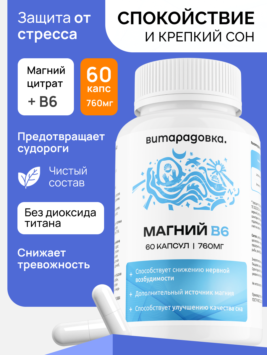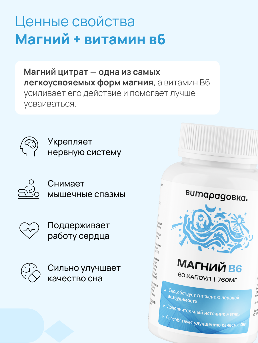 Магний в форме цитрата обладает высокой биодоступностью, что позволяет организму эффективно восполнять его недостаток. Дополнительное содержание витамина B6 усиливает действие магния, улучшая усвоение минерала клетками организма.