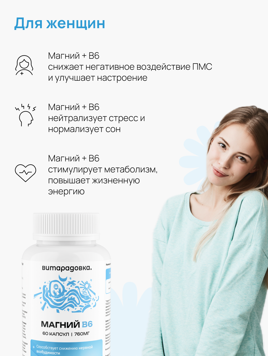Этот продукт также включает кальций для укрепления костей и повышения общей физической активности. Честный знак на упаковке подтверждает высокое качество ингредиентов. Комплекс биологической добавки на основе магния и витамина B6 способствует поддержанию здоровья нервной системы, нормализации обменных процессов и снижению усталости.