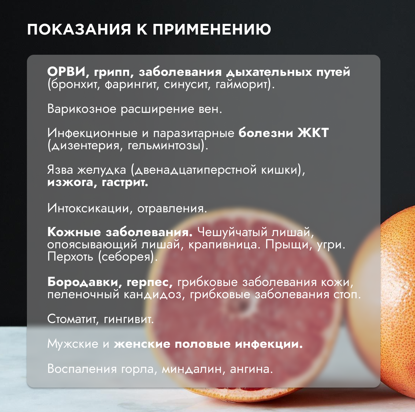 Различные виды гриппа и другие ОРВИ Парагрипп Ангина Женские, дрожжевые инфекции Варикозное расширение вен и трофические язвы Герпес Грибки кожи и слизистых, грибки на ногтях Угревая сыпь, дерматиты, красный и плоский лишай Папилломы, кондиломы, бородавки на коже