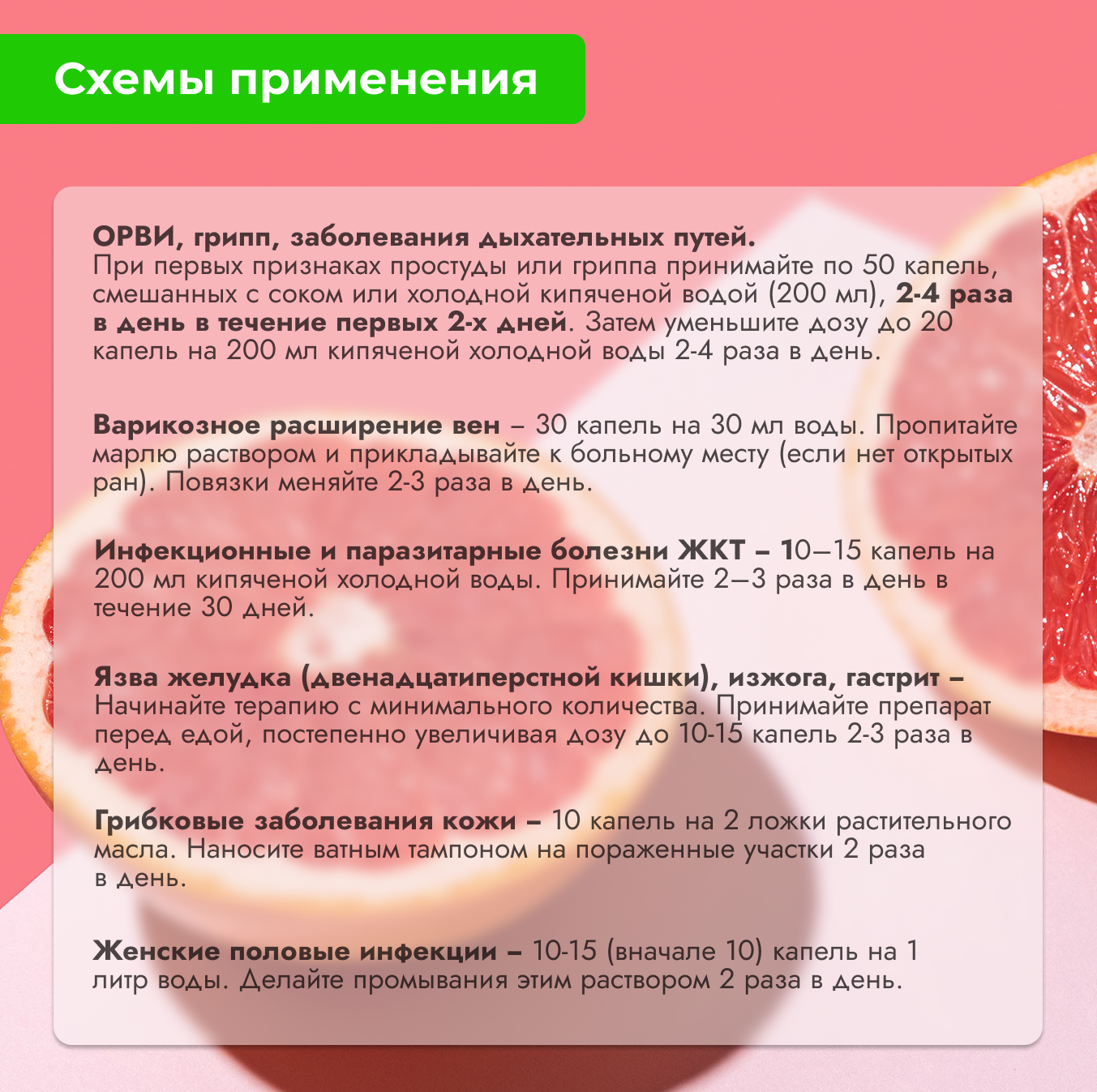 Акушерство и гинекология: женские грибковые и бактериальные инфекции: прием внутрь + орошение слизистых. Способ применения и дозы: Внутрь только в разведенном виде: Цитросепт® следует принимать в дозах 10 - 45 капель (в зависимости от массы тела и тяжести заболевания) 2-3 раза в день в разведении с 100 - 200 мл любой жидкости, тщательно перемешав. Жидкость может быть теплой, но не горячей. Можно использовать кипяченую воду.